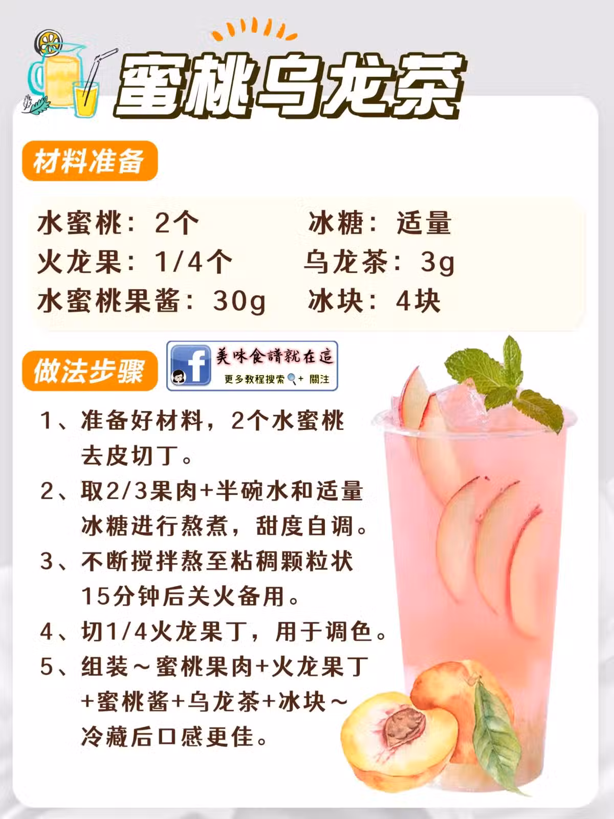 📋材料準備:水蜜桃2個、冰糖適量、火龍果1/4個、烏龍茶3g、水蜜桃果醬30g、冰塊4塊