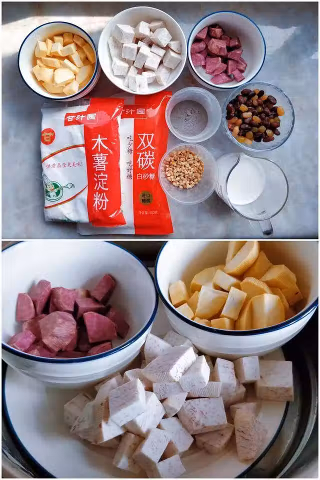 2. 將紅薯、芋頭、紫薯去皮,切小塊,放入蒸鍋,大火蒸15分鐘蒸熟。