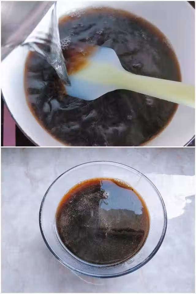 4. 邊攪勻邊煮沸,然後倒在碗中,放到一邊靜置晾涼到凝固,仙草凍就做好了。