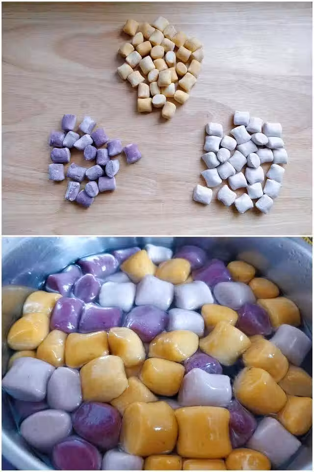 11. 紅薯泥和紫薯泥也是重複第6到第10步的過程。切好的芋圓表面可以撒少許木薯澱粉,以免粘連。