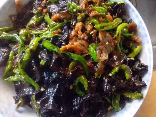 乾淨的鍋里放上油,油熱後放入用澱粉和醬油腌好的肉絲,翻炒熟後放入木耳炒,再青椒進去翻炒熟,嘗依稀啊,味道淡了放鹽、醬油