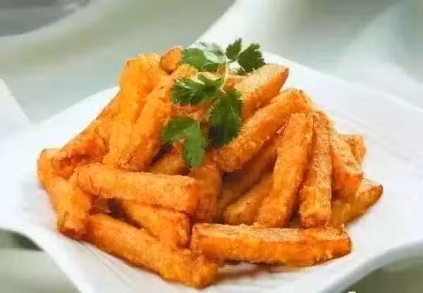 4、將炒鍋內的油燒至七成熱時將炸過的瓜條放入鍋中復炸,炸至金黃色撈出瀝油裝盤,撒上花椒鹽即可上桌供食。