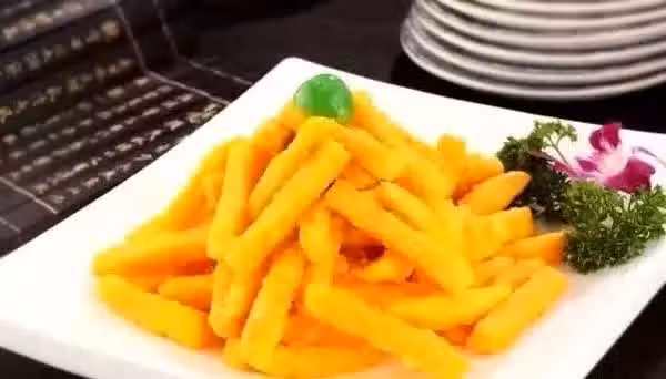4. 炒鍋注油燒至五成熱,將南瓜條逐條蘸勻蛋糊下入油內炸至金黃色,撈起控油。