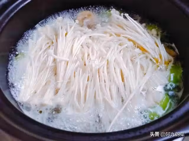 7.金針菇下鍋大概煮2-3分鐘就可以的了,出鍋之前,再調入少許鹽和雞精,撒上蔥花拌勻,這樣一道清淡營養的絲瓜雞湯就做好了,前後烹煮時間大約半個鐘,過程操作非常的簡單,相信大家看完就能上手的,喜歡的趕緊試一試,非常好喝又解暑。