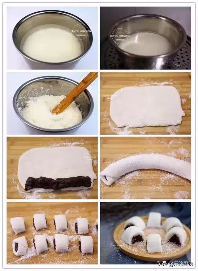 3、做好的糯米糰會很粘。所以,面板上一定要多撒一些椰蓉。