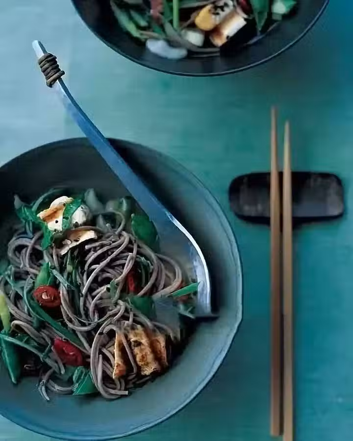 3、在鍋中的固體瀝出,燒開,加入蕎麥麵和醬油,煮至有嚼勁。添加白菜、荷蘭豆和辣椒,煮至蔬菜熟後添加更多醬油,關火,放入豆腐和芝麻。