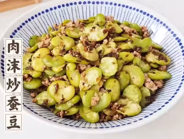 2.水開加入1小勺食鹽,放入蠶豆焯水2分鐘撈出鍋中倒入少許油,放入肉餡炒散。