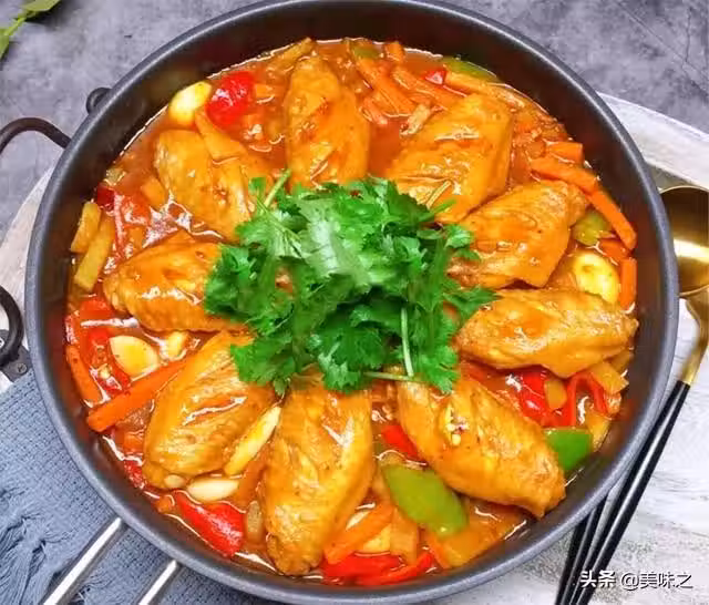 雞翅中10個、土豆1個、胡蘿蔔1根、洋蔥半個、青辣椒2根、紅辣椒2根、香菜2根、大蒜2頭、姜1塊、大蔥1段、白砂糖2克、澱粉3克、番茄醬2湯匙、黃豆醬2湯匙、蚝油2湯匙、海鮮醬油2湯匙、白鬍椒粉半湯匙、油辣椒粉1湯匙、生抽2湯匙、料酒1湯匙、老抽1湯匙、鹽1克、黃油適量。