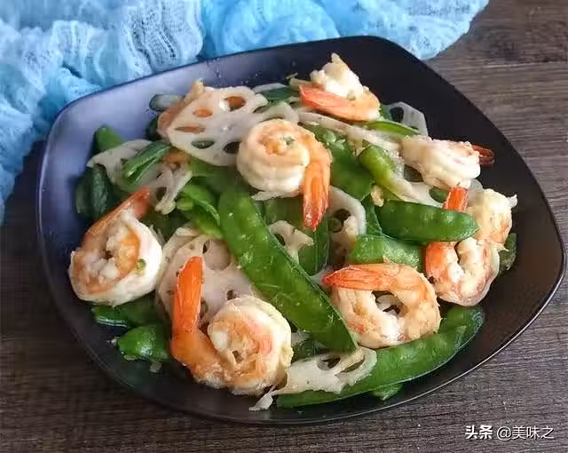 8、蓮菜,荷蘭豆撈出控水倒入鍋里和蝦仁一起翻炒均勻。