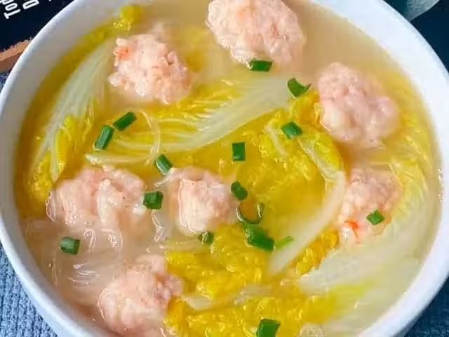 食材:大蝦、娃娃菜、粉絲、雞蛋、食鹽、胡椒粉、澱粉、雞精、小蔥