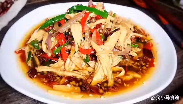 2.拌菜盆中,加入干辣椒乾花椒,用熱油潑香,加入一勺帶有芝麻的糊辣油,調入鹽、一品鮮醬油、十三香,少許胡椒粉,香醋、香油、花椒油、一勺雞湯,充分攪勻,倒入手撕雞,洋蔥絲、辣椒絲,充分拌勻,即可裝盤。