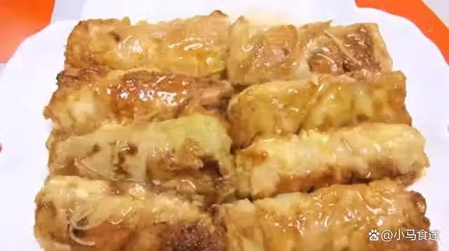 4.起鍋燒油,將鍋滑透防止粘鍋,碗中打入幾個雞蛋,加點鹽打勻,將卷好的白菜卷粘裹上蛋液,逐一下入鍋中,將剩餘的蛋液倒入,煎至兩面金黃,先盛出擺入盤中備用。