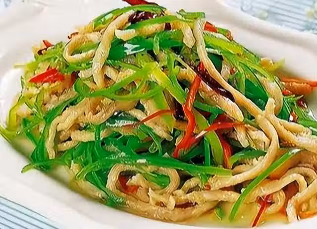 1. 青椒擇洗乾淨,切成0.3厘米的絲,淘洗去子,豬肉切成10厘米長,0.3厘米粗的二粗絲,放入碗內,加鹽、水豆粉拌勻。