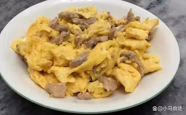 3.再起鍋燒油,倒入蛋液,雞蛋滑熟,,下入肉片,翻炒均勻,即可出鍋裝盤。