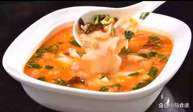西紅柿燴麵片,湯汁紅潤,面片勁道,連湯帶面一起吃,咸鮮略帶微酸,開胃解膩還好吃。