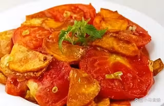 3.鍋留底油,下入蔥花,小火炒出香味,放入西紅柿,翻炒至炒出汁,放入土豆片,調入白糖、白醋、鹽,翻炒均勻,再調入雞精翻炒入味,再撒入少許蔥花,炒勻出鍋,裝盤即可。