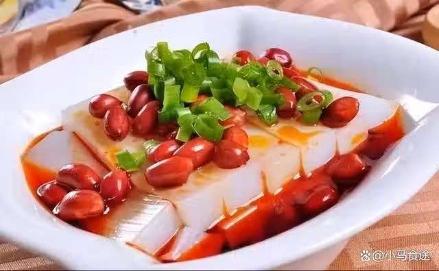 3.空盤中放上涼粉,再把搗碎的花生倒在上面,澆上味汁,吃的時候拌勻即可。