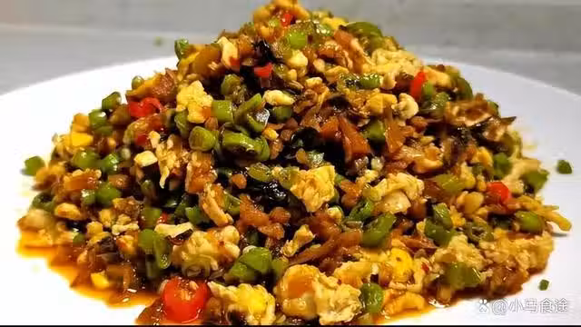 2.起鍋燒油,下入五花肉末炒酥,烹入料酒,加入醬油上色,下入豆角丁煸炒斷生,倒入適量袋裝成品外婆菜翻炒入味,調入少許白糖和味精,最後加入炒好的雞蛋翻炒均勻,出鍋裝盤即可。