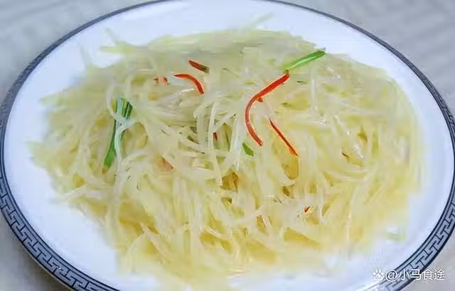 清炒土豆絲,土豆絲最簡單的炒法,講究清脆爽口,色澤潔白,調味非常簡單,吃著略帶咸鮮,家常的口感,非常考究廚藝功底。