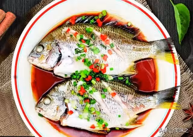 3、5分鐘後取出魚,盤裡的魚湯記得倒掉,撒上蔥花10克,紅椒粒5克,再加入準備好的蒸魚鼓油。