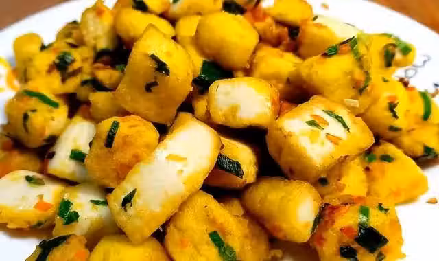 炒饃花,饃饃改刀切丁,裹上蛋液,下入鍋中煎一下,直接加入胡椒粉、鹽、生抽、五香粉、花椒粉、雞精、韭菜段,炒勻即可出鍋裝盤。