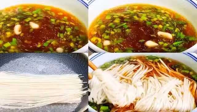 澆湯麵,空碗中加入熬香的豬油、醬油、蔥花、蒜末、味精、鹽、香油、花椒油、蔥油、香醋倒入熱開水,將煮熟的細掛麵放入湯中,即可食用。