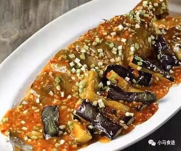 3.另鍋放油燒熱,先下姜米、蒜米、蔥花、泡椒末炒香,摻適量鮮湯燒開後,加鹽、白糖、香醋和味精調成魚香味,把炸好的茄子下鍋略燒,勾薄芡便起鍋舀在盤中魚上面,撒上蔥花即成。
