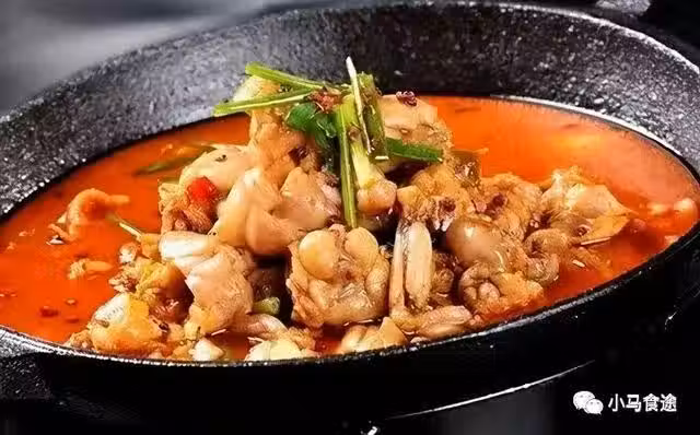 2.煸小料、燒主料:鍋入底油燒至四成熱,下入薑末、蒜末爆香,加郫縣豆瓣碎煸炒出紅油,放入泡椒碎、泡菜粒、泡姜粒、藿香碎各小火煸炒去水汽,摻入高湯,倒入牛蛙、豆腐條小火煮3分鐘,出鍋裝盤。