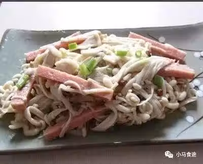 材料:熟火腿肉、金針菇、鹽、雞精、白砂糖、香油。