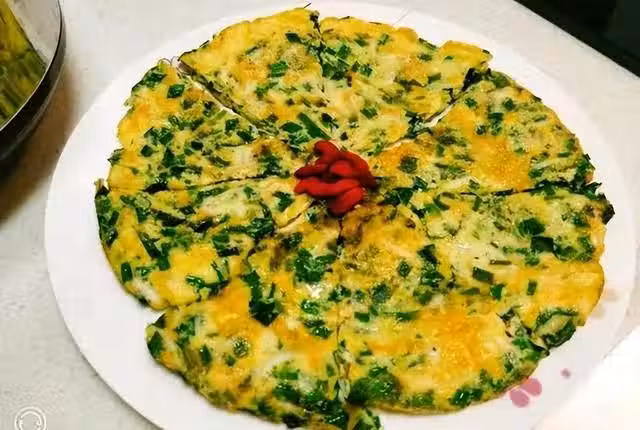 2.起鍋燒油,下入韭菜蛋液,煎至定型,翻到另外一面,煎一下,即可出鍋裝盤。