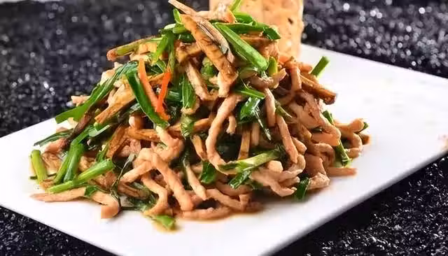 2.起鍋燒油,下入肉絲滑散,下入姜蔥炒香,下入香乾炒勻,烹入料酒,調入鹽、味精、醬油,翻炒入味,下入韭菜段,炒斷生淋入少許水澱粉即可出鍋裝盤。