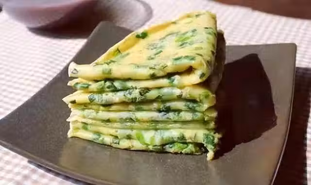 2.煎餅鍋預熱,刷油,倒入麵糊,攤成薄餅,不用翻面,烙熟即可出鍋。