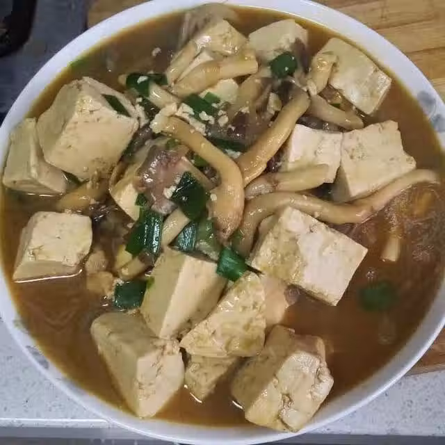 平菇200g;老豆腐一小塊;大蔥一小截;生抽2勺;老抽1勺;糖1勺;大蒜葉一根