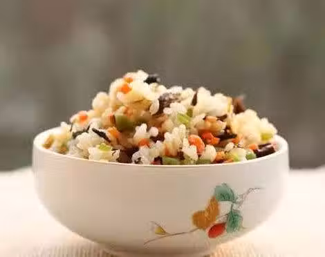 米飯兩碗,尖椒一個,胡蘿蔔半根,梅乾菜一把,鹽1/2小匙,糖1/2小匙,金蘭醬油1小匙,植物油適量。