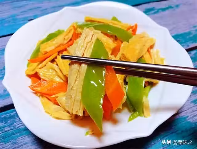 尖椒30g、胡蘿蔔30g、腐竹100g、蒜5g、油0.5勺、鹽1匙、味精0.2匙。