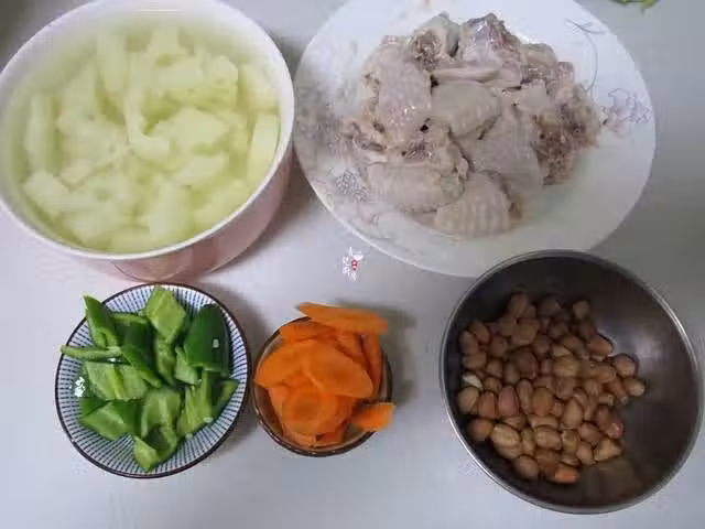 2、把蓮藕去皮後切成片後洗凈,再泡入清水裡,裡面再滴入幾滴白醋,這樣就不會變黑了。雞中翅裡面加入黃酒,生粉和鹽抓勻後靜置半小時,青椒洗凈切片,胡蘿蔔去皮洗凈後切片,備好花生米。
