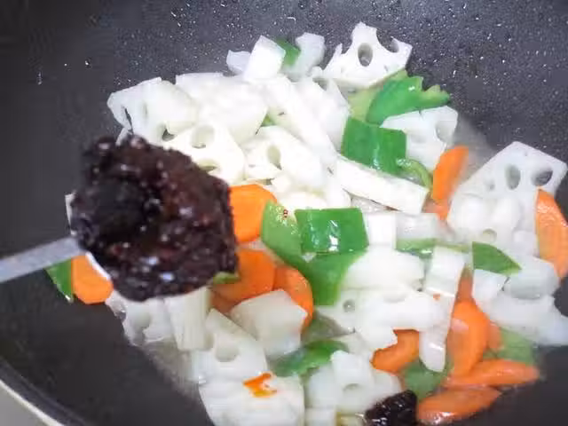 6、加入一湯匙香油豆瓣醬翻炒均勻,豆瓣醬偏鹹的,所以加了豆瓣醬就不要加鹽了。