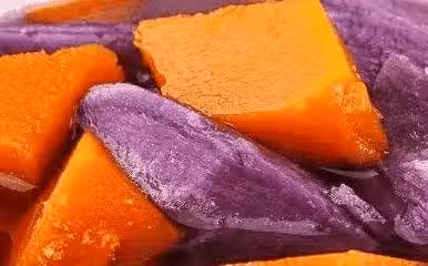 1 把洗凈去皮的南瓜切小塊。洗凈去皮的紫薯切成小塊。