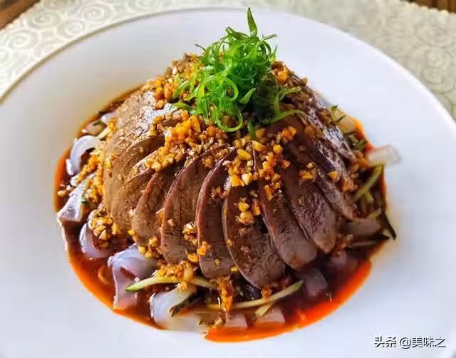 4、將拉皮和黃瓜絲墊底,擺上切好的豬心,澆入料汁即可。