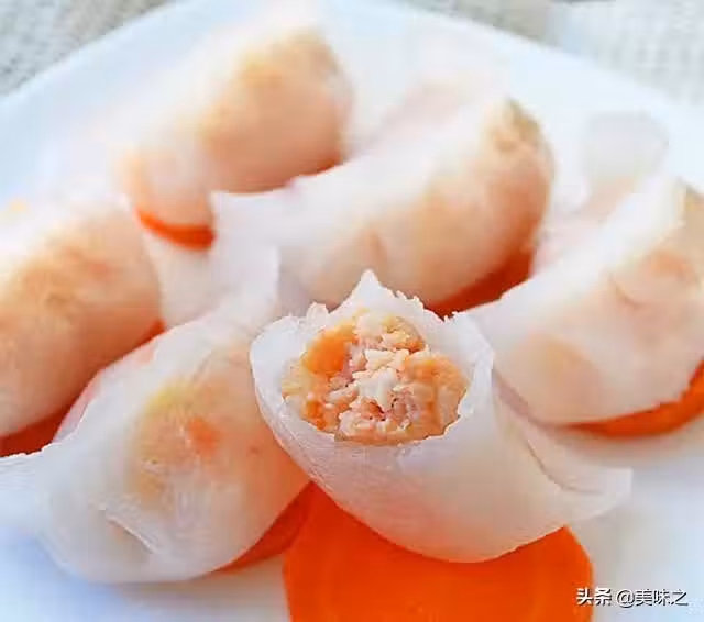 15、將包好的水晶蝦餃擺放在胡蘿蔔片上。