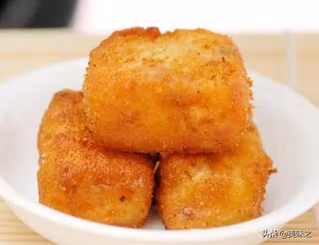 5、取一塊,沾上蛋黃液,再沾上麵包糠,小火,炸至外皮膨脹裡面熟透。