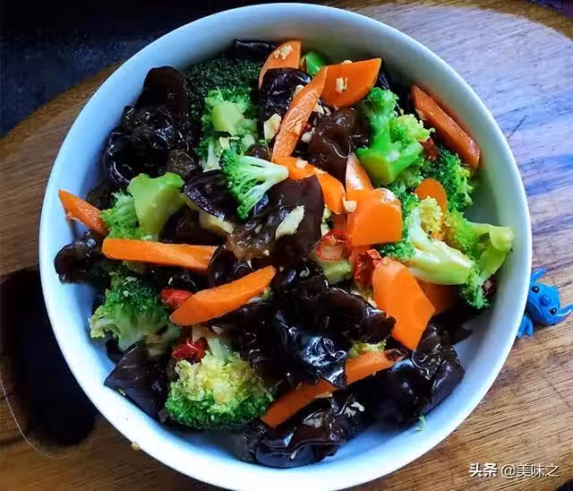 西蘭花、木耳、胡蘿蔔、蒜、油、鹽、生抽、干紅椒。