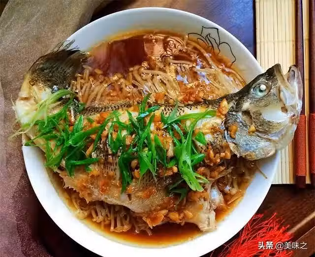 鱸魚一條、金針菇半把、蔥適量、蒜適量、姜適量、油適量、鹽適量、蒸魚豉油適量、糖適量、水適量、蚝油適量。