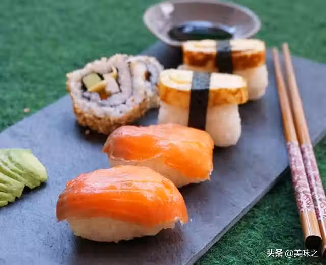 8、做好的飯糰,上面放一點點芥末醬,再放上三文魚片就完成。