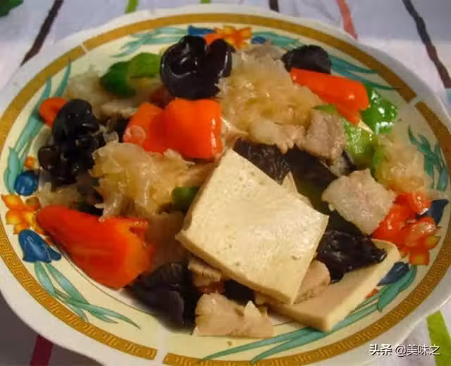 千頁豆腐一盒、五花肉200克、銀耳一朵、木耳適量、姜適量、青椒一個、紅椒一個、蒜適量、鹽適量。