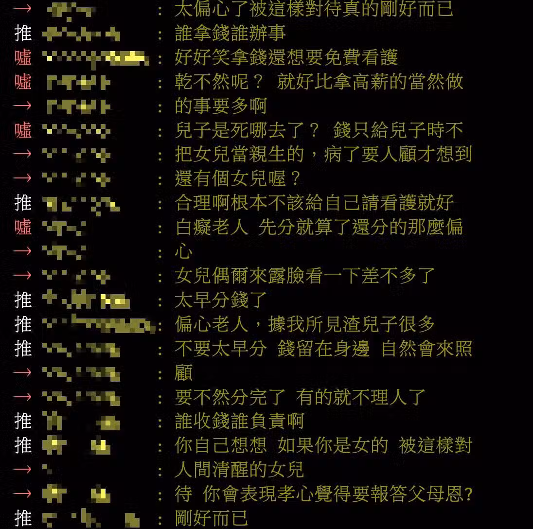不給女兒,希望兒子照顧,結果就被聯手送進養老院。」、「親戚也是重男輕女,