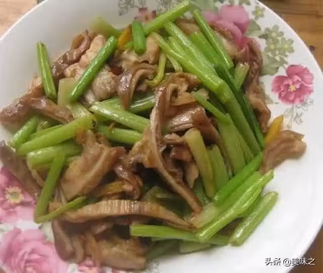 6、倒入豬肚絲爆炒,再倒入芹菜翻炒片刻就可出鍋。