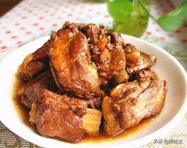 排骨適量、白糖適量、鹽適量、干紅辣椒適量、姜適量、蒜適量、花椒適量、八角適量、生抽適量、老抽適量、料酒適量。