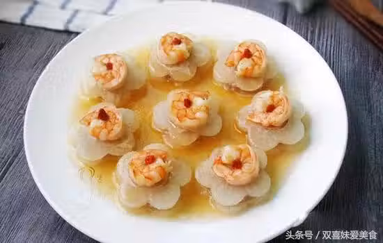 2、雞蛋豆腐切成八塊排盤,每一塊豆腐上排上一隻蝦子,撒上薑末。