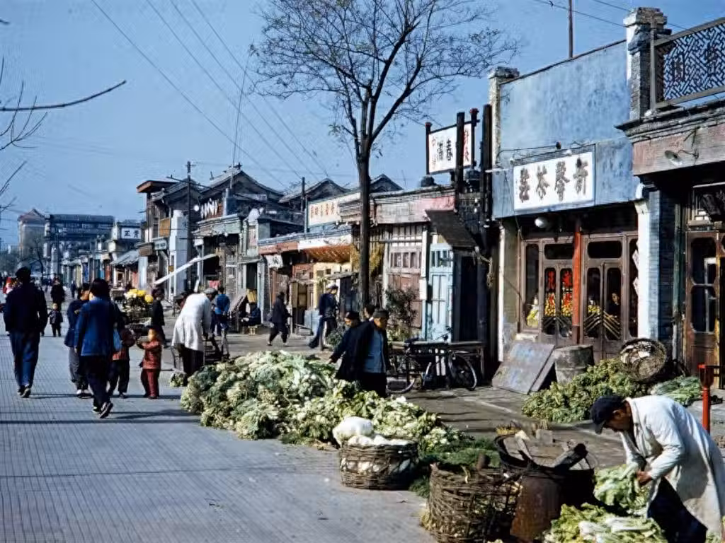 1959年北京街頭的菜市場,當時的物流條件較差,北方的冬天很難買到豐富的蔬菜,家家戶戶都買大白菜過冬。從圖中可見,儘管當時沒有高樓大廈,房子非常破舊,但是還算乾淨整齊。